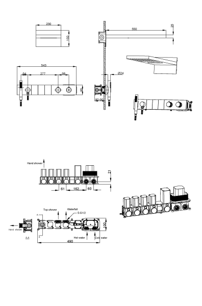 Верхний душ размером 550мм*230мм с функцией тропического душа и водопада. Форсунки soft-silicone с функцией антикальк и комфортной очисткой.