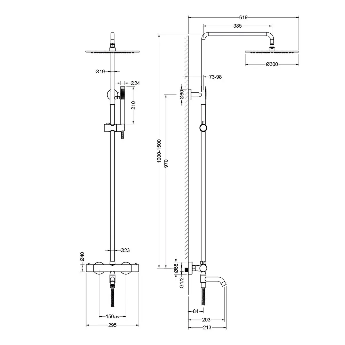 • Штанга душевой системы: регулируется по высоте