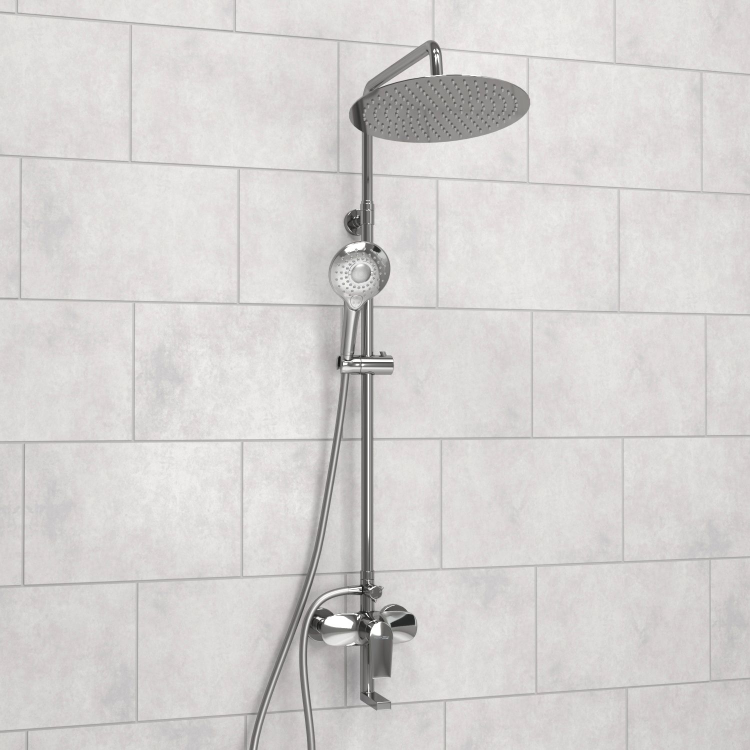 Душевой комплект легко монтируется к стене c помощью двух эксцентриков (подключение смесителя) и одного крепежного элемента (крепление стойки для душа к стене).