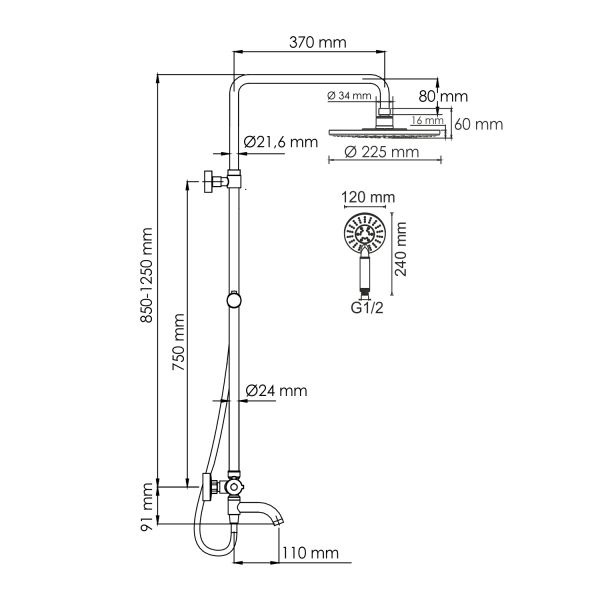 Стойка для душа, Ø 22 мм регулируемая по высоте