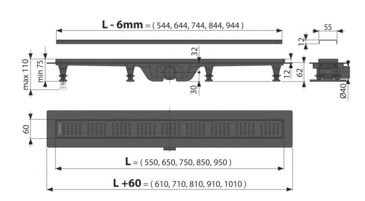 Душевой лоток AlcaPlast с порогами для перфорированной решетки 95см черный матовый APZ10BLACK-950M