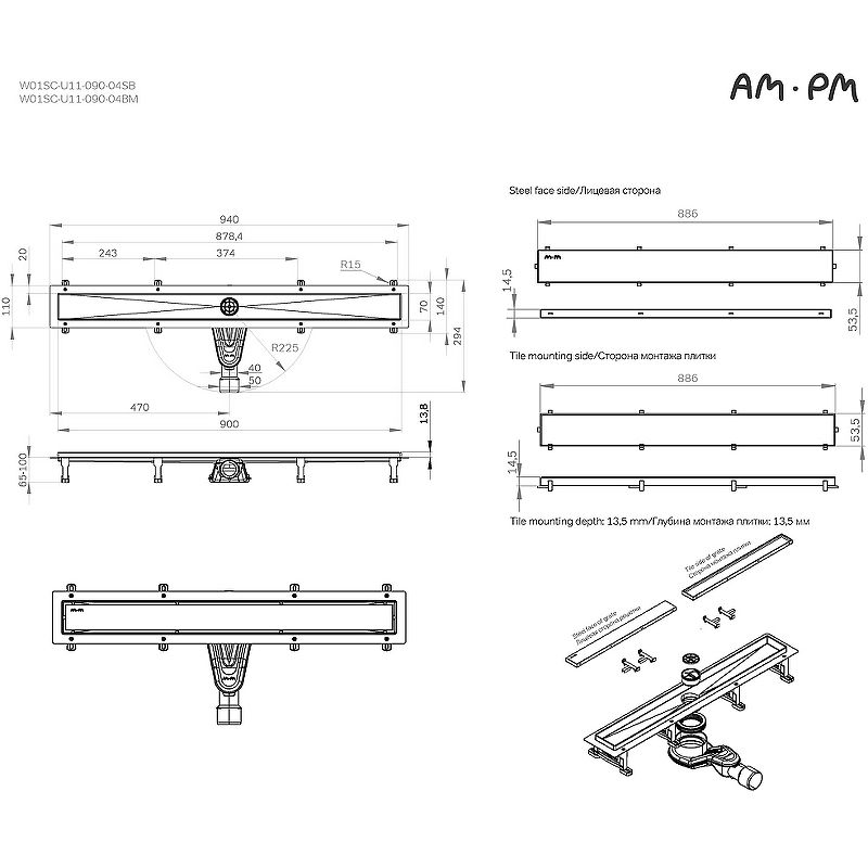 Душевой лоток AM.PM MasterFlow 90 W01SC-U11-090-04SB с решеткой Хром матовый / под плитку Tile Подробнее
