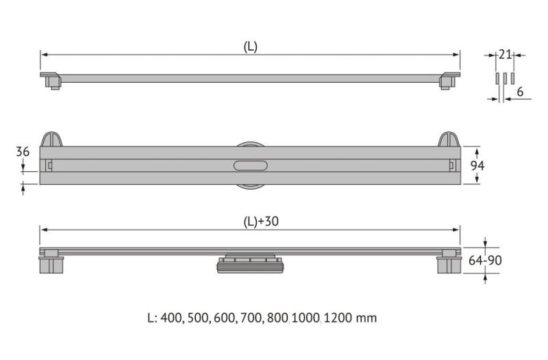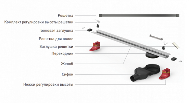 Решетка и декоративные заглушки, нержавеющая сталь AISI 304Комплект регулировки решетки по высоте от 8 до 25ммСетка для волос, пластикКомплект гидроизоляцииЖелоб водосток, нержавеющая сталь AISI 304Монтажная заглушка, пенопластРегулируемые по высоте ножки, пластикСамопромывной S-образный сифон PP:Горизонтальный выпуск D50/105мм H30/135мм, пропускная способность 42л/мин, монтаж 360°Монтажный ключ, пластик