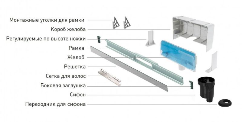 Решетка и рамка, нержавеющая сталь AISI 304Комплект регулировки рамки и монтажные углыСетка для волос, нержавеющая сталь AISI 304Комплект гидроизоляцииЖелоб водосток пристенныйPP Регулируемые по высоте ножки, пластикСамопромывной S-образный сифон с переходником PPВертикальный выпуск S-сифон D50/105мм H30/135мм, пропускная способность 42л/мин, монтаж 360°Монтажный ключ, пластик