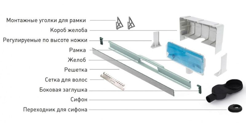 Решетка и рамка, нержавеющая сталь AISI 304Комплект регулировки рамки и монтажные углыСетка для волос, нержавеющая сталь AISI 304Комплект гидроизоляцииЖелоб водосток пристенныйPP Регулируемые по высоте ножки, пластикСамопромывной S-образный сифон с переходником PPГоризонтальный выпуск D50 H60, пропускная способность 42л/мин, монтаж 360°Монтажный ключ, пластик