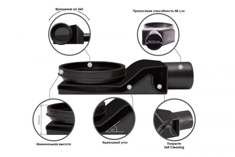 - Материал: нержавеющая сталь AISI 304 SS – дизайн-вставка, рамка; ABS – корпус; PP – переходник, сифон, грязеулавливающая сеточка, сухой затвор.