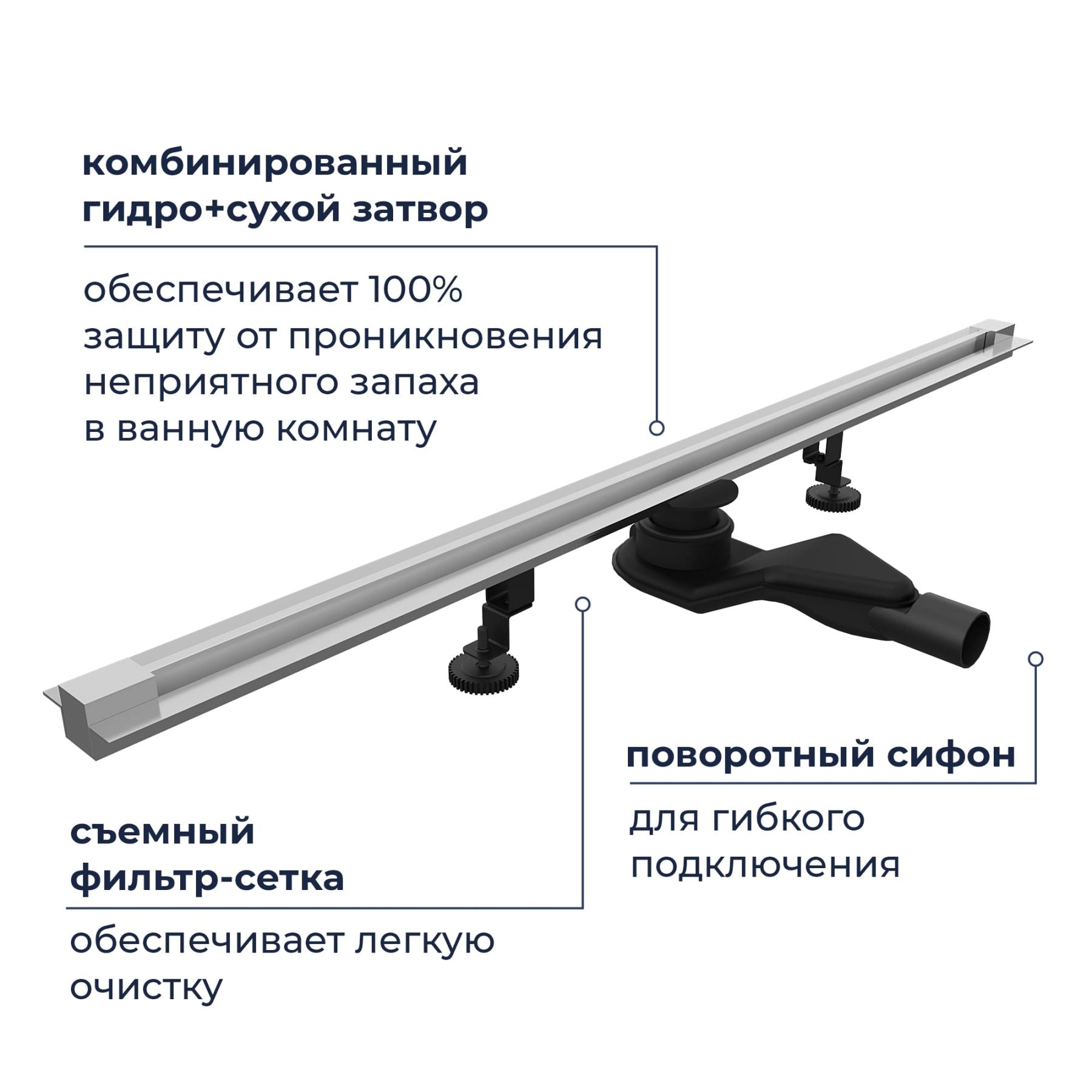 Принимающей декоративный жёлоб маскирует сливное устройство, образует щель, куда сливается вся вода из душевого пространства. Для того чтобы вода эффективно отводилась в трап, на этапе монтажа необходимо обеспечить уклон облицовочной плитки в сторону принимающего жёлоба.Для доступа к технической части устройства с целью очистки необходимо извлечь среднюю часть жёлоба вместе с боковыми декоративными заглушками.Лоток выполнен из нержавеющей стали толщиной 2 мм, собирает стекающую воду и за счёт технического уклона отводит её в сетку-фильтр, которая задерживает волосы и мелкий мусор.Далее вода проходит в сифон с комбинированным затвором, Первая вода сталкивается с сухим затвором, который изготовлен из высокопрочного ABS-пластика. Затвор выполнен в виде крышки с силиконовой прокладкой, крышка открывается под давлением воды и плотно притягивается при отсутствии воды за счёт пружинного механизма, обеспечивая 100% защиту от проникновения неприятных запахов в ванную комнату из канализации.После вода проходит через сифон с гидрозатвором и сливается в канализацию.Сифон с гидрозатвором присоединяется к нижней части лотка трапа и имеет боковой отвод с поворотом на 360 градусов, что позволяет подключить канализационный сток с любой стороны.