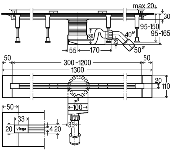 Душевой лоток Viega Advantix Vario Set 704353 укорачиваемый 300-1200 мм хром матовый;пропускная способность 0,4-0,8 л/с;Регулируемая высота 95–165 ммКомплектация:
