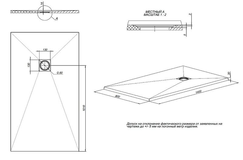 Размеры (ШхВхД): 1400х30х800 мм.