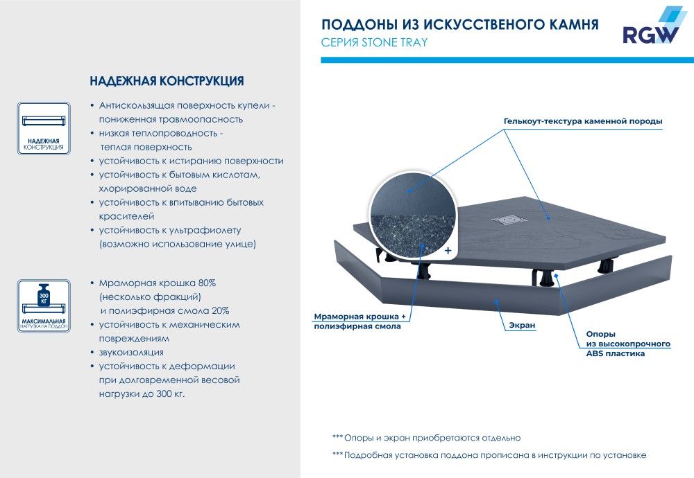 Душевые поддоны RGW ST с фактурой под сланцевый камень.Что вам известно о технологии «искусственный камень»?Это рельефная, но не ребристая поверхность, безопасная для всех членов семьи, в сочетании с низкой теплопроводностью материала для ощущения нагретого солнцем камня под вашими ступнями.Это высокотехнологичный материал - 80% мраморной крошки плюс полиэфирные смолы - обеспечивает беспрецедентную устойчивость к механическим, химическим и другим видам повреждений, делают уборкой легкой и и быстрой, а также выдерживает долговременную весовую нагрузку до 300 кг.В серии душевых поддонов Stone Tray появилась новинка уникальной трапециевидной формы в остро-модном цвете «графит».Форма трапеции - идеальное решение для компактной ванной комнаты и позволит по максимум использовать полезное пространство, например, для мебели или бытовой техники. Поддон представлен в двух размерах при необходимости материал позволяет обрезать изделие по индивидуальному размеру.Сдержанный темно-серый цвет впишет поддон в любой интерьер, сделав особый комплимент стилям лофт и хайтек, и позволит реализовать самые яркие идеи в остальном декоре ванной комнаты.Обратите внимание: фактические размеры с учетом заполнения швов могут меняться в пределах -8/+2 мм.По вашему желанию можем установить поддон на ножки: