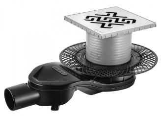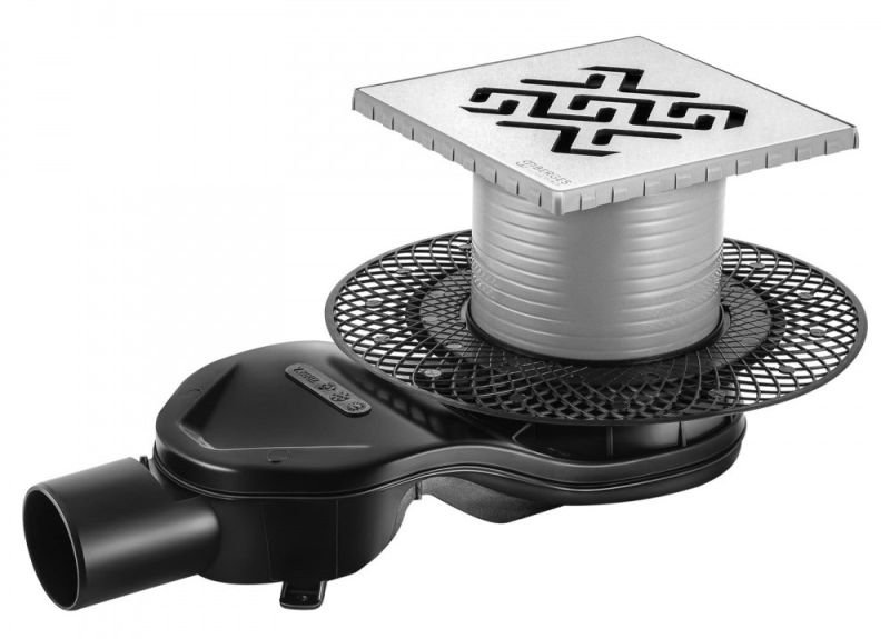 Решетка толщина 3мм, нержавеющая сталь AISI 304Горловина трапа, пластикФланец трапа с переходником, РРМонтажная заглушка, PPСамопромывной S-образный сифон PPГоризонтальный выпуск D50 H60, пропускная способность 42л/мин, монтаж 360°Монтажный ключ, пластик