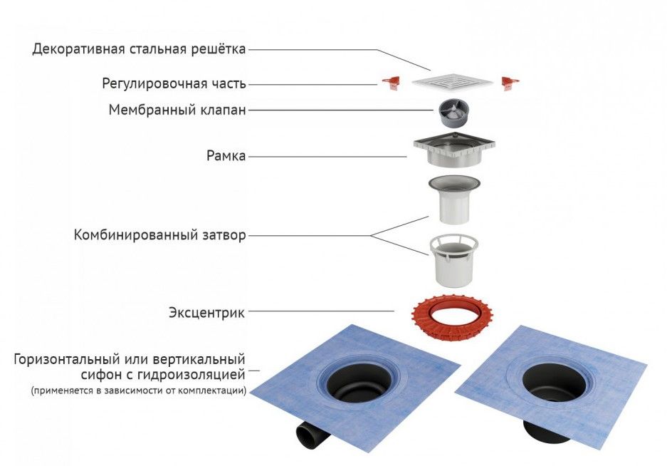 Решетка толщина 3 мм, нержавеющая сталь AISI 304Горловина трапа и эксцентрик, пластикМонтажная заглушка, PPСифон PP с гидроизоляциейГоризонтальный выпуск D50 H65, монтаж 360°Комбинированный затворФланец с 3 сторон загибается на 90°Монтажный ключ, пластик