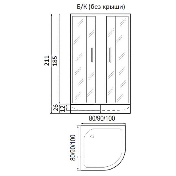 Типы и размеры:без поддона 100*100*185с поддоном 100*100*211 Матовое стекло, профиль матовый хромДушевое ограждение для ванной комнаты полукруглое с боковым регулировочным профилем и саморегулирующимися металическами, хромированными, двойными роликами.