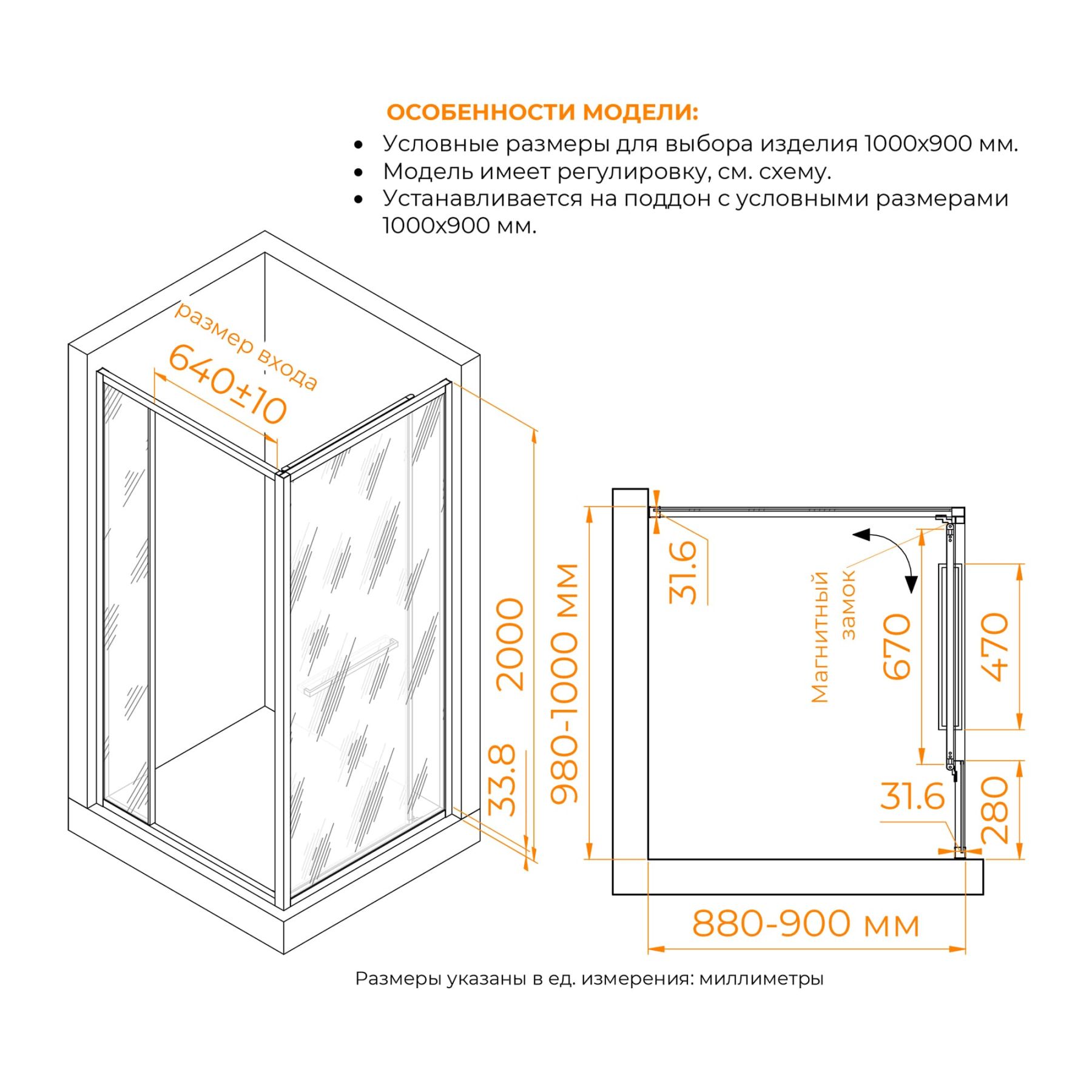 Прямоугольный угол образуют три стекла - два стационарных полотна и одно полотно «Дверь», которое при нажатии на дверную ручку плавно толкает дверное полотно вовнутрь душевой зоны к боковому стационарному стеклу. Магнитный замок, вмонтированный в профиль двери, качественно герметизирует вход.Душевое ограждение имеет универсальную установку открытия двери – с левой или правой стороны.