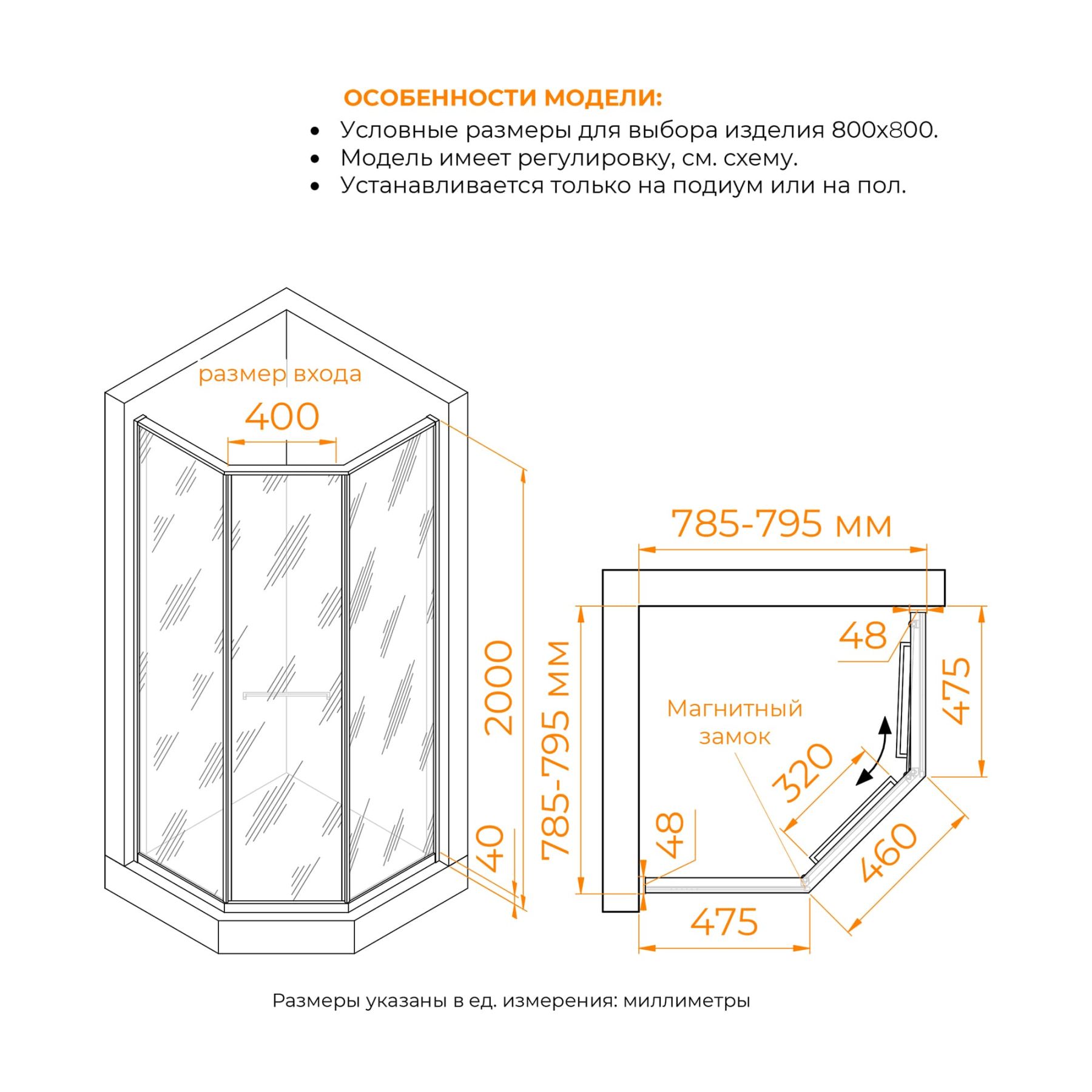 Дизайн:Вариативность цветовой гаммы и изящество профиля из нержавеющей стали позволят создать индивидуальный интерьер и премиальный внешний вид.Цвет профиля:картинки: хром, чёрный (B), оружейная сталь (Gr), золото браш (Gb)Исполнения стекла:прозрачное, тонированное, чёрная вуаль (Triplex), золотая вуаль (Triplex) Надёжность: Модели оснащены высокопрочным профилем из нержавеющей стали, премиальным закалённым стеклом Triplex 8 мм, усиленной раздвижной системой и стальной фурнитурой, такая комплектация позволяет обеспечить безупречную безопасность, высокую надёжность и срок службы более 15 лет.Удобство:Инновационный механизм раздвижной системы при открытии плавно смещает дверь вдоль стационарного стекла при этом обеспечивая комфортный вход и просторное пространство внутри душевого угла.С внутренней стороны двери, ручка с удобным ухватам, которая может служить держателем для душевых принадлежностей.Монтаж:Изделия можно установить, как на плитку с трапом так и на поддон соответствующего размера. (с поддоном стандартного размера не совместим (см. схему изделия)