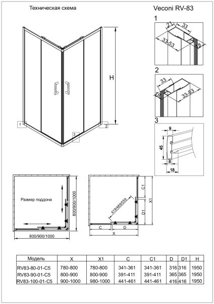 Душевой уголок Veconi Rovigo RV-83, 800x800x1950, никель брашинг, прозрачное стекло
