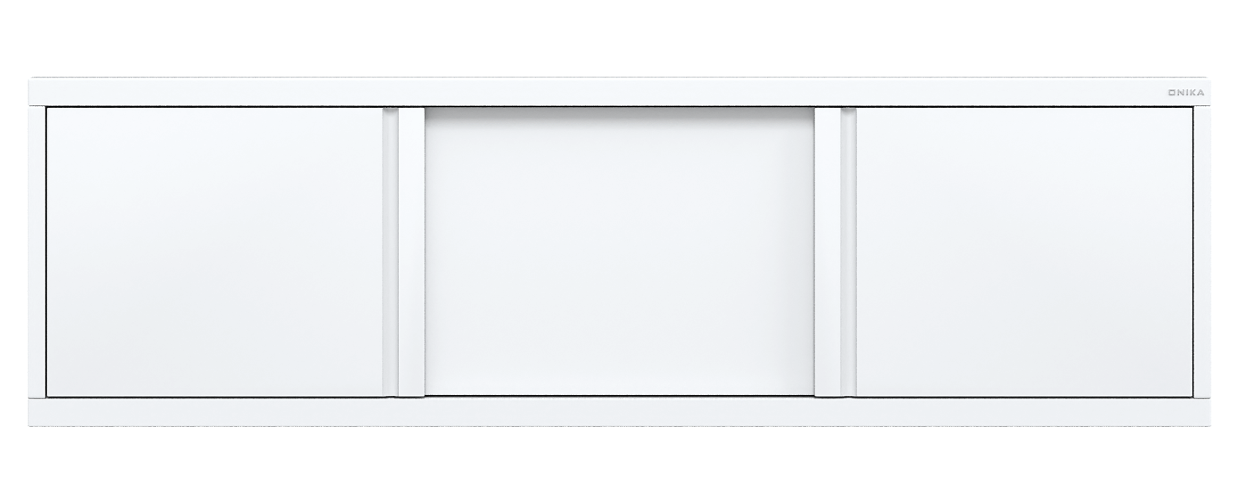 По всему периметру экрана расположена усиленная рама, выполненная из алюминия. Конструкция имеет три подвижные раздвижные двери из МДФ, покрытых высокоглянцевой белой пленкой. На боковых дверцах расположены интегрированные ручки.