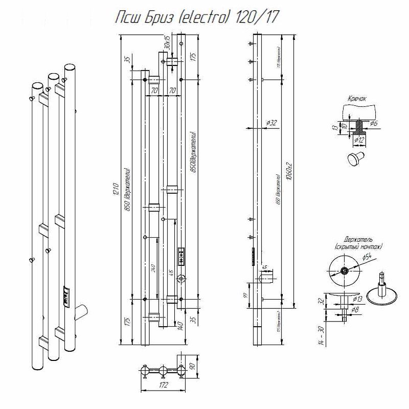 Электрический полотенцесушитель Altasan Бриз Бриз12017БМ Белый матовый 120х17Данный полотенцесушитель имеет два вида подключения: подключение стандартным кабелем с вилкой 220 Вольт и скрытое подключение к заранее подведенной на месте установки проводке. Во втором случае необходимо обжать жилы проводки дополнительными клемниками (идут в комплекте) и подсоединить их к жилам полотенцесушителя, согласно цветовой разметки.