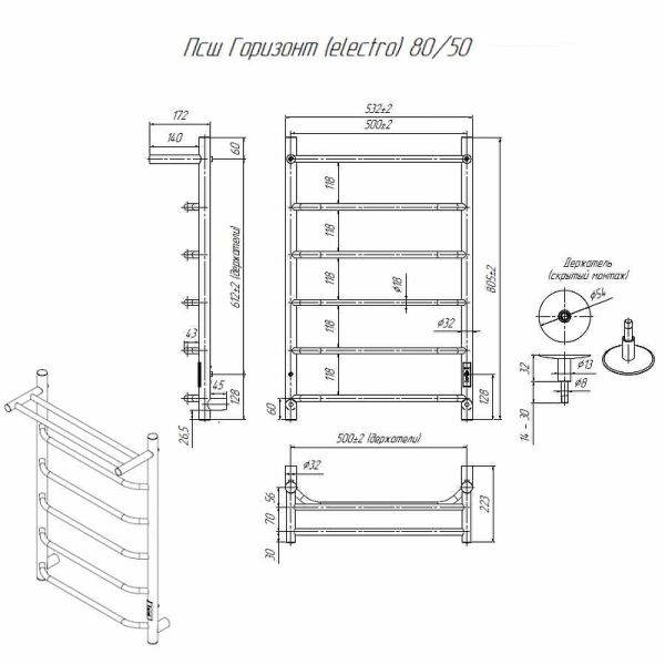 Электрический полотенцесушитель Altasan Горизонт П Горизонт8050П с полкой Хром 80х50Данный полотенцесушитель имеет два вида подключения: подключение стандартным кабелем с вилкой 220 Вольт и скрытое подключение к заранее подведенной на месте установки проводке. Во втором случае необходимо обжать жилы проводки дополнительными клемниками (идут в комплекте) и подсоединить их к жилам полотенцесушителя, согласно цветовой разметки. Подключение можно осуществить, как по левой стороне, так и по правой (имеются соответствующие отводы на каждой из вертикальных труб).