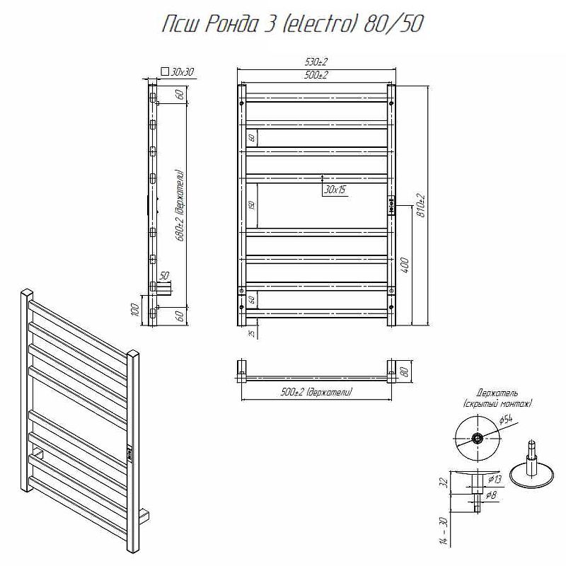 Электрический полотенцесушитель Altasan Ронда 3 Проф Ронда3Проф8050ЧМ Черный муар 80х50Данный полотенцесушитель имеет два вида подключения: подключение стандартным кабелем с вилкой 220 Вольт и скрытое подключение к заранее подведенной на месте установки проводке. Во втором случае необходимо обжать жилы проводки дополнительными клемниками(идут в комплекте) и подсоединить их к жилам полотенцесушителя, согласно цветовой разметки. Подключение можно осуществить, как по левой стороне, так и по правой (имеются соответствующие отводы на каждой из вертикальных труб).