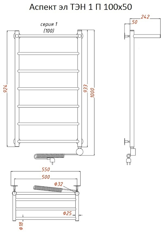 Внимание! Для скрытого монтажа электропроводки необходимо приобрести комплект скрытого подключения.Полотенцесушитель электрический комплектуется ТЭНом с терморегулятором и таймером.Изделие производится из нержавеющей стали AISI 201. Вертикальные трубы d -32 мм., для горизонтальных вставок используется труба d — 18 мм.Нагревательным элементом в полотенцесушителе является ТЭН. Полотенцесушитель заполнен бытовым антифризомЭкономичность: ТЭН нагревает антифриз до нужной температуры и выключается, далее при остывании полотенцесушителя он включается опять. Таким образом он работает не постоянно и получается, что ТЭН потребляет электричество не 300 Вт, а порядка 100 — 150 ВтМощность электрического прибора порядка 100 Вт при стоимости 1 Вт — 5 руб несложно посчитать: 100Вт х 24 = 2,4 кВт в сутки. Стоимость эксплуатации изделия за сутки 2,4 кВт х 5 руб. = 12 руб. При максимальной температуре расход электричества за 30 дней составит порядка 360 руб. При условии если сушка работает круглосуточно на максимальной температуре.Удобство монтажа: Полотенцесушитель крепится к стене на четыре держателя. Изначально ТЭН не установлен в полотенцесушитель для безопасной транспортировки, его можно установить, как справа, так и слева предварительно перевернув полотенцесушитель вверх ногами и выкрутив заглушку с нужной стороны на место в которое установится ТЭН.Примечание. Внимательно изучите инструкцию по установке ТЭНа!Скрытое подключение: Для скрытого монтажа электропроводки необходимо приобрести комплект скрытого подключения.Подключение в розетку: В комплекте с ТЭНом имеется шнур с вилкой, который будет необходим при подключении к розетке.