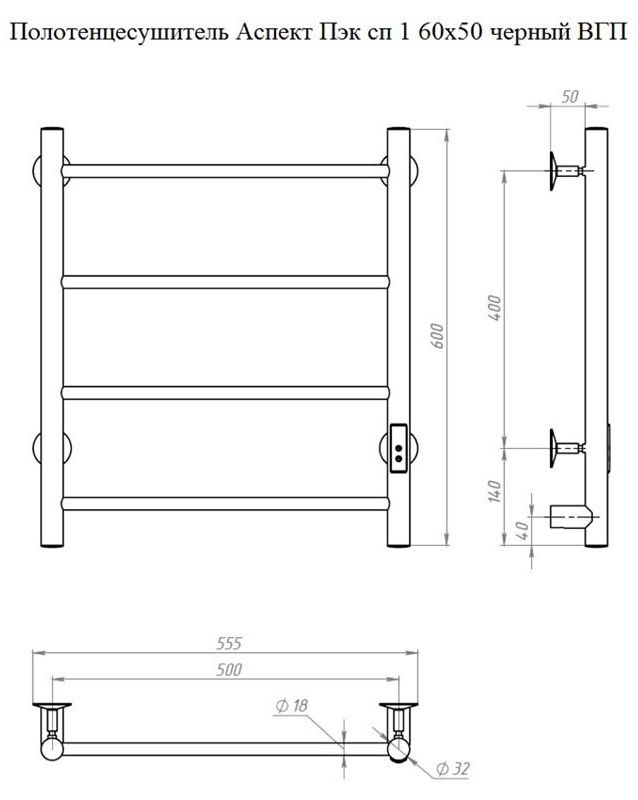 Электрический полотенцесушитель Тругор Аспект Пэк сп 1 60x50см чёрный АспектПэксп1/6050чернВГП