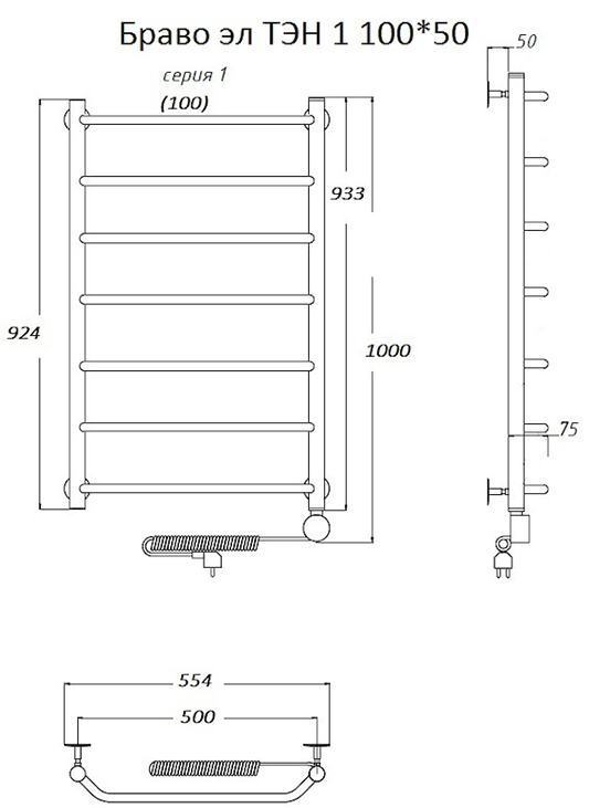 Электрический полотенцесушитель Тругор Браво 1 100x50см хром Браво1/элТЭН10050