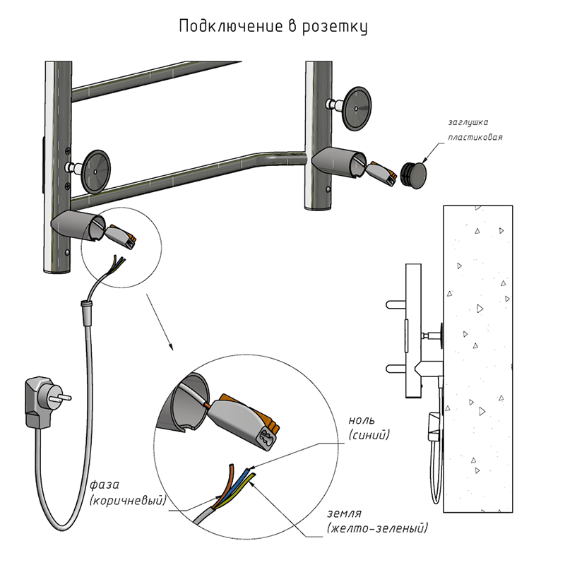 Внимание! Для скрытого монтажа электропроводки необходимо приобрести комплект скрытого подключения. Полотенцесушитель электрический комплектуется ТЭНом с терморегулятором и таймером. Изделие производится из нержавеющей стали AISI 201. Вертикальные трубы d -32 мм., для горизонтальных вставок используется труба d — 18 мм. Нагревательным элементом в полотенцесушителе является ТЭН. Полотенцесушитель заполнен бытовым антифризом.Экономичность: ТЭН нагревает антифриз до нужной температуры и выключается, далее при остывании полотенцесушителя он включается опять. Таким образом он работает не постоянно, и получается, что ТЭН потребляет электричество не 300 Вт, а порядка 100 — 150 Вт.Мощность электрического прибора порядка 100 Вт при стоимости 1 Вт — 5 руб несложно посчитать: 100Вт х 24 = 2,4 кВт в сутки. Стоимость эксплуатации изделия за сутки 2,4 кВт х 5 руб. = 12 руб. При максимальной температуре расход электричества за 30 дней составит порядка 360 руб. При условии если сушка работает круглосуточно на максимальной температуре.Удобство монтажа: Полотенцесушитель крепится к стене на четыре держателя. Изначально ТЭН не установлен в полотенцесушитель для безопасной транспортировки, его можно установить, как справа, так и слева предварительно перевернув полотенцесушитель вверх ногами и выкрутив заглушку с нужной стороны на место в которое установится ТЭН.Примечание. Внимательно изучите инструкцию по установке ТЭНа!Скрытое подключение: Для скрытого монтажа электропроводки необходимо приобрести комплект скрытого подключения.Подключение в розетку: В комплекте с ТЭНом имеется шнур с вилкой, который будет необходим при подключении к розетке.