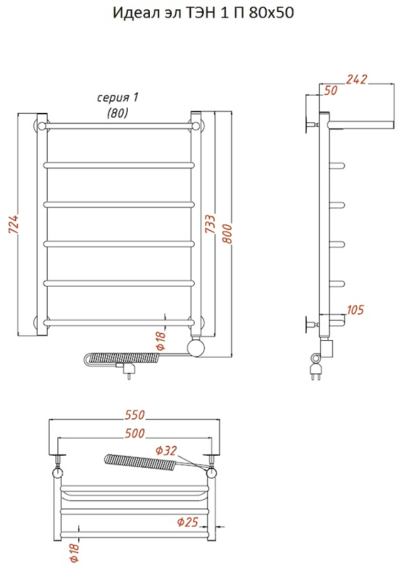 Внимание! Для скрытого монтажа электропроводки необходимо приобрести комплект скрытого подключения.Полотенцесушитель электрический комплектуется ТЭНом с терморегулятором и таймером.Изделие производится из нержавеющей стали AISI 201. Вертикальные трубы d -32 мм., для горизонтальных вставок используется труба d — 18 мм.Нагревательным элементом в полотенцесушителе является ТЭН. Полотенцесушитель заполнен бытовым антифризомЭкономичность: ТЭН нагревает антифриз до нужной температуры и выключается, далее при остывании полотенцесушителя он включается опять. Таким образом он работает не постоянно и получается, что ТЭН потребляет электричество не 300 Вт, а порядка 100 — 150 ВтМощность электрического прибора порядка 100 Вт при стоимости 1 Вт — 5 руб несложно посчитать: 100Вт х 24 = 2,4 кВт в сутки. Стоимость эксплуатации изделия за сутки 2,4 кВт х 5 руб. = 12 руб. При максимальной температуре расход электричества за 30 дней составит порядка 360 руб. При условии если сушка работает круглосуточно на максимальной температуре.Удобство монтажа: Полотенцесушитель крепится к стене на четыре держателя. Изначально ТЭН не установлен в полотенцесушитель для безопасной транспортировки, его можно установить, как справа, так и слева предварительно перевернув полотенцесушитель вверх ногами и выкрутив заглушку с нужной стороны на место в которое установится ТЭН.Примечание. Внимательно изучите инструкцию по установке ТЭНа!Скрытое подключение: Для скрытого монтажа электропроводки необходимо приобрести комплект скрытого подключения.Подключение в розетку: В комплекте с ТЭНом имеется шнур с вилкой, который будет необходим при подключении к розетке.