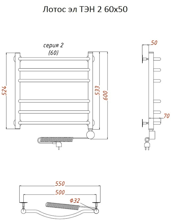 Внимание! Для скрытого монтажа электропроводки необходимо приобрести комплект скрытого подключения.Полотенцесушитель электрический комплектуется ТЭНом с терморегулятором и таймером.Изделие производится из нержавеющей стали AISI 201. Вертикальные трубы d -32 мм., для горизонтальных вставок используется труба d — 18 мм.Нагревательным элементом в полотенцесушителе является ТЭН. Полотенцесушитель заполнен бытовым антифризомЭкономичность: ТЭН нагревает антифриз до нужной температуры и выключается, далее при остывании полотенцесушителя он включается опять. Таким образом он работает не постоянно и получается, что ТЭН потребляет электричество не 300 Вт, а порядка 100 — 150 ВтМощность электрического прибора порядка 100 Вт при стоимости 1 Вт — 5 руб несложно посчитать: 100Вт х 24 = 2,4 кВт в сутки. Стоимость эксплуатации изделия за сутки 2,4 кВт х 5 руб. = 12 руб. При максимальной температуре расход электричества за 30 дней составит порядка 360 руб. При условии если сушка работает круглосуточно на максимальной температуре.Удобство монтажа: Полотенцесушитель крепится к стене на четыре держателя. Изначально ТЭН не установлен в полотенцесушитель для безопасной транспортировки, его можно установить, как справа, так и слева предварительно перевернув полотенцесушитель вверх ногами и выкрутив заглушку с нужной стороны на место в которое установится ТЭН.Примечание. Внимательно изучите инструкцию по установке ТЭНа!Скрытое подключение: Для скрытого монтажа электропроводки необходимо приобрести комплект скрытого подключения.Подключение в розетку: В комплекте с ТЭНом имеется шнур с вилкой, который будет необходим при подключении к розетке.