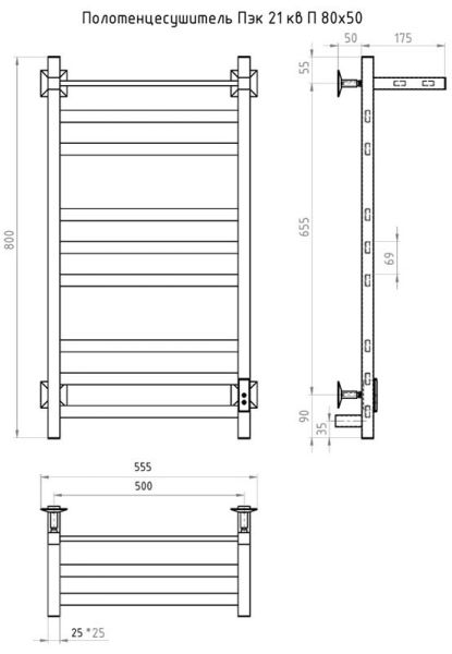 ПЭК — Полотенцесушитель электрический кабельный. Изделие производится из нержавеющей стали AISI 201. Вертикальные трубы d -32 мм., для горизонтальных вставок используется труба d — 18 мм.Нагревательным элементом в полотенцесушителе является греющий кабель — аналог «теплого пола», кабель заправляется внутрь каждой трубы и передает тепло на поверхность изделия. Во включенном состоянии постоянно поддерживается температура 50-600.Экономичность: Полотенцесушитель снабжен панелью управления. Кнопка включения/выключения и таймер на 2 часа и 4 часа, который позволяет включать изделие на ограниченное время. Эта функция дает возможность экономить электричество.Мощность электрического прибора порядка 60W при стоимости 1 кВт — 5 руб несложно посчитать: 60W х 24 = 1,5 кВт в сутки. Стоимость эксплуатации изделия за сутки 1,5 кВт х 5 руб. = 7,5 руб. Максимальный расход электричества за месяц примерно 225 руб. При условии если сушка работает круглосуточно.Удобство монтажа: Полотенцесушитель крепится к стене на четыре держателя. Универсальное исполнение изделия позволяет подключить его, как справа, так и слева.Скрытое подключение: Благодаря приваренным в нижней части вертикальных труб двум распаячным коробкам, в которых соединяется электропроводка, возможно скрытое подключение к электричеству слева и справа.Подключение в розетку: В комплекте также имеется шнур с вилкой, который будет необходим при подключении к розетке.Панель включения:РЕЖИМ №1 — постоянный нагревРЕЖИМ №2 — работа в течение 2 часов с последующим отключением.РЕЖИМ №3 — работа в течение 4 часов с последующим отключением.