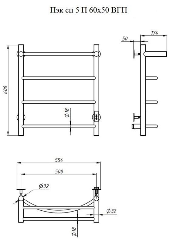ПЭК — Полотенцесушитель электрический кабельный. Изделие производится из нержавеющей стали AISI 201. Вертикальные трубы d -32 мм., для горизонтальных вставок используется труба d — 18 мм.Нагревательным элементом в полотенцесушителе является греющий кабель — аналог «теплого пола», кабель заправляется внутрь каждой трубы и передает тепло на поверхность изделия. Во включенном состоянии постоянно поддерживается температура 50-600.Экономичность: Полотенцесушитель снабжен панелью управления. Кнопка включения/выключения и таймер на 2 часа и 4 часа, который позволяет включать изделие на ограниченное время. Эта функция дает возможность экономить электричество.Мощность электрического прибора порядка 60W при стоимости 1 кВт — 5 руб несложно посчитать: 60W х 24 = 1,5 кВт в сутки. Стоимость эксплуатации изделия за сутки 1,5 кВт х 5 руб. = 7,5 руб. Максимальный расход электричества за месяц примерно 225 руб. При условии если сушка работает круглосуточно.Удобство монтажа: Полотенцесушитель крепится к стене на четыре держателя. Универсальное исполнение изделия позволяет подключить его, как справа, так и слева.Скрытое подключение: Благодаря приваренным в нижней части вертикальных труб двум распаячным коробкам, в которых соединяется электропроводка, возможно скрытое подключение к электричеству слева и справа.Подключение в розетку: В комплекте также имеется шнур с вилкой, который будет необходим при подключении к розетке.Панель включения:РЕЖИМ №1 — постоянный нагревРЕЖИМ №2 — работа в течение 2 часов с последующим отключением.РЕЖИМ №3 — работа в течение 4 часов с последующим отключением.