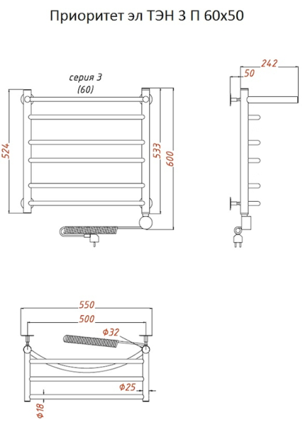 Внимание! Для скрытого монтажа электропроводки необходимо приобрести комплект скрытого подключения.Полотенцесушитель электрический комплектуется ТЭНом с терморегулятором и таймером.Изделие производится из нержавеющей стали AISI 201. Вертикальные трубы d -32 мм., для горизонтальных вставок используется труба d — 18 мм.Нагревательным элементом в полотенцесушителе является ТЭН. Полотенцесушитель заполнен бытовым антифризомЭкономичность: ТЭН нагревает антифриз до нужной температуры и выключается, далее при остывании полотенцесушителя он включается опять. Таким образом он работает не постоянно и получается, что ТЭН потребляет электричество не 300 Вт, а порядка 100 — 150 ВтМощность электрического прибора порядка 100 Вт при стоимости 1 Вт — 5 руб несложно посчитать: 100Вт х 24 = 2,4 кВт в сутки. Стоимость эксплуатации изделия за сутки 2,4 кВт х 5 руб. = 12 руб. При максимальной температуре расход электричества за 30 дней составит порядка 360 руб. При условии если сушка работает круглосуточно на максимальной температуре.Удобство монтажа: Полотенцесушитель крепится к стене на четыре держателя. Изначально ТЭН не установлен в полотенцесушитель для безопасной транспортировки, его можно установить, как справа, так и слева предварительно перевернув полотенцесушитель вверх ногами и выкрутив заглушку с нужной стороны на место в которое установится ТЭН.Примечание. Внимательно изучите инструкцию по установке ТЭНа!Скрытое подключение: Для скрытого монтажа электропроводки необходимо приобрести комплект скрытого подключения.Подключение в розетку: В комплекте с ТЭНом имеется шнур с вилкой, который будет необходим при подключении к розетке.
