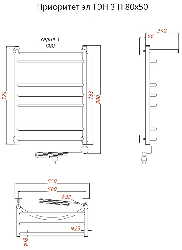 Внимание! Для скрытого монтажа электропроводки необходимо приобрести комплект скрытого подключения.Полотенцесушитель электрический комплектуется ТЭНом с терморегулятором и таймером.Изделие производится из нержавеющей стали AISI 201. Вертикальные трубы d -32 мм., для горизонтальных вставок используется труба d — 18 мм.Нагревательным элементом в полотенцесушителе является ТЭН. Полотенцесушитель заполнен бытовым антифризомЭкономичность: ТЭН нагревает антифриз до нужной температуры и выключается, далее при остывании полотенцесушителя он включается опять. Таким образом он работает не постоянно и получается, что ТЭН потребляет электричество не 300 Вт, а порядка 100 — 150 ВтМощность электрического прибора порядка 100 Вт при стоимости 1 Вт — 5 руб несложно посчитать: 100Вт х 24 = 2,4 кВт в сутки. Стоимость эксплуатации изделия за сутки 2,4 кВт х 5 руб. = 12 руб. При максимальной температуре расход электричества за 30 дней составит порядка 360 руб. При условии если сушка работает круглосуточно на максимальной температуре.Удобство монтажа: Полотенцесушитель крепится к стене на четыре держателя. Изначально ТЭН не установлен в полотенцесушитель для безопасной транспортировки, его можно установить, как справа, так и слева предварительно перевернув полотенцесушитель вверх ногами и выкрутив заглушку с нужной стороны на место в которое установится ТЭН.Примечание. Внимательно изучите инструкцию по установке ТЭНа!Скрытое подключение: Для скрытого монтажа электропроводки необходимо приобрести комплект скрытого подключения.Подключение в розетку: В комплекте с ТЭНом имеется шнур с вилкой, который будет необходим при подключении к розетке.