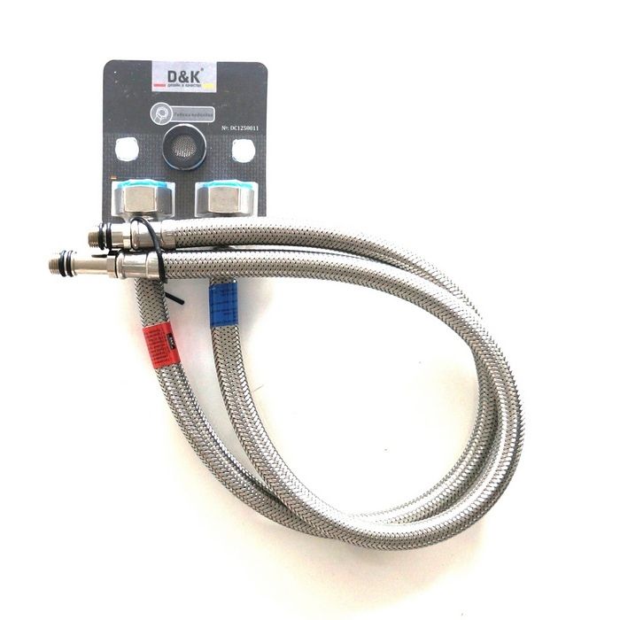 Гибкая подводка DQ гайка 1/2-штуцер М10, 50 см DC1250011 - для смесителя Гарантия 5лет. Размеры: Наружный диаметр шланга: 12,5мм Длина: 50см. Максимальное рабочее давление: 20 Бар Максимальная рабочая температура: 120гр. Комплектующие: Внутренний шланг - EPDM (нетоксичный каучук) - Оплетка из нержавеющей стали AISI-304 Плетение из 7 (семи) нитей. - Гайки, штуцер, пресс-гильза - из нержавеющей стали AISI-304 - Нипель - из латуни класса "А" - Штуцеры разной длины, для удобства монтажа в смеситель. В комплекте прокладки с металической сеткой, являются фильтром жесткой очистки. Устанавливаются в гайки фиксирующие подводку к трубам.
