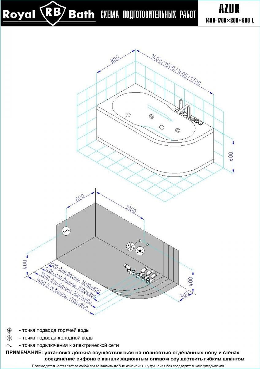 Акриловая ванна Royal Bath - идеальный выбор для создания атмосферы релакса и умиротворения, как в просторной в ванной комнате, так и в комнатном санузле. Основным преимуществом ванны из акрила считается её малый вес, высокая гигиеничность данного материала и низкая теплопроводность, долго сохраняющая комфортную температуру воды.Форма ванны Royal Bath замечательно подойдет к любому интерьерному решению, в различных вариантах размещения внутри ванной комнаты. Пристенная установка - это наиболее традиционный вид установки, а при использовании декоративного экрана пространство под ванной можно использовать как место хранения моющих средств. Оптимальная глубина позволяет принимать ванну с максимальным комфортом и полным расслаблением. Ванна Royal Bath выполнена со строгим соблюдением всех значительных элементов современного стиля.Благодаря тому, что родина бренда Royal Bath - Россия, можно смело быть уверенным в непревзойденном качестве и долговечности ванны, так как производство полностью соответствует стандартам качества. Акриловая ванна Royal Bath - это незаменимый, основной элемент любой ванной комнаты, без которого невозможно обойтись, ни в многоквартирном доме, ни в загородном коттедже.Комплектация гидромассажной ванны:- акриловая ванна Azur 170x80x60;- каркас сварной к ванне Azur 170;- панель к ванне Azur 170;- гидромассажная система на 5 форсунок;- спинной массаж на 6 форсунок;- аэромассаж с хромотерапией 8 форсунок;- слив-перелив для ванны полуавтомат 60 см.Ожидаемый срок поставки 7 дней.Обратите внимание: данная позиция поставляется под заказ! Товар поставляется по 100%-ной предоплате.Данный товар является заказным и имеет индивидуально-определенные свойства.