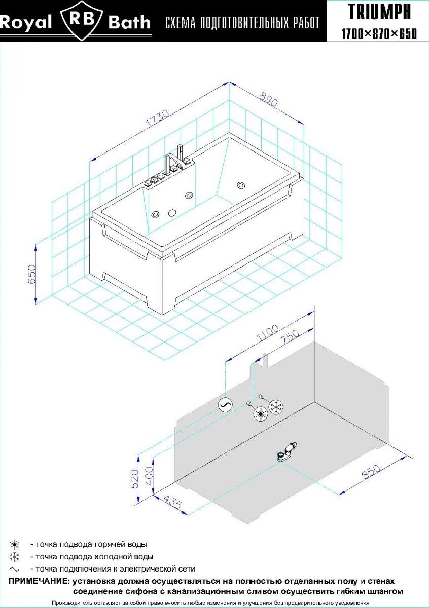 Акриловая ванна Royal Bath - идеальный выбор для создания атмосферы релакса и умиротворения, как в просторной в ванной комнате, так и в комнатном санузле. Основным преимуществом ванны из акрила считается её малый вес, высокая гигиеничность данного материала и низкая теплопроводность, долго сохраняющая комфортную температуру воды.Форма ванны Royal Bath замечательно подойдет к любому интерьерному решению, в различных вариантах размещения внутри ванной комнаты. Пристенная установка - это наиболее традиционный вид установки, а при использовании декоративного экрана пространство под ванной можно использовать как место хранения моющих средств. Оптимальная глубина позволяет принимать ванну с максимальным комфортом и полным расслаблением. Ванна Royal Bath выполнена со строгим соблюдением всех значительных элементов современного стиля.Благодаря тому, что родина бренда Royal Bath - Россия, можно смело быть уверенным в непревзойденном качестве и долговечности ванны, так как производство полностью соответствует стандартам качества. Акриловая ванна Royal Bath - это незаменимый, основной элемент любой ванной комнаты, без которого невозможно обойтись, ни в многоквартирном доме, ни в загородном коттедже.Комплектация гидромассажной ванны:- акриловая ванна Triumph 170х87х65 в сборе;- гидромассажная система на 6 форсунок;- аэромассаж с хромотерапией на 8 форсунок;- cмеситель на борт ванны RB Triumph 501;- слив-перелив для ванны полуавтомат 80 см.Ожидаемый срок поставки 7 дней.Обратите внимание: данная позиция поставляется под заказ! Товар поставляется по 100%-ной предоплате.Данный товар является заказным и имеет индивидуально-определенные свойства.