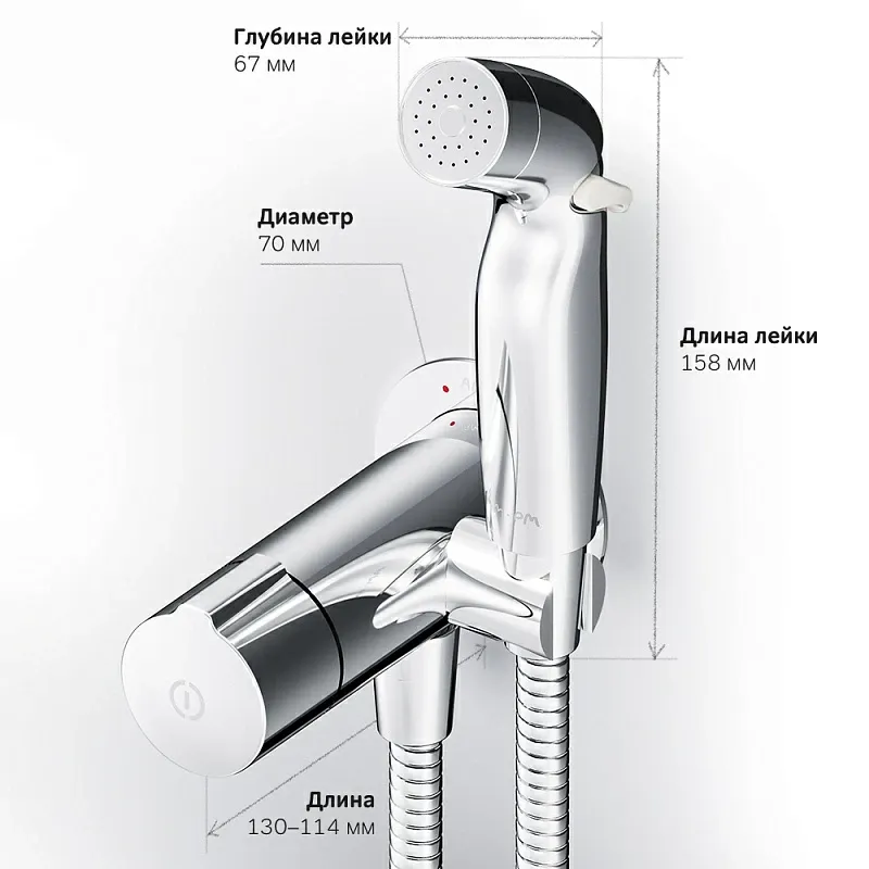 Гигиенический душ со смесителем AM.PM X-Joy F0H85A500 хром встраиваемыйВстраиваемый гигиенический душ сo смесителем AM.PM X-Joy и шлангом 1200 мм. Коллекция X-Joy включает в себя по-настоящему дизайнерские продукты в своем ценовом сегменте. Разработанные дизайн-агентством GP designpartners из Австрии, они завоевали любовь многих покупателей. Размер (Ш/Г/В): 70x178x158 мм. Материал - латунь, Zamak, нержавеющая сталь, PPA. Цвет - хром. 1 режим гигиенического душа - Spray.