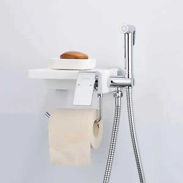 Смеситель встраиваемый Gappo G7296 с гигиеническим душем, полочкой и бумагодержателем. Корпус смесителя изготовлен из латуни с хромированным покрытием, полочка из искусственного камня белый кварц. Душевой шланг в комплекте.