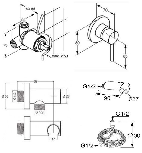 - гигиенический набор - комплект: встраиваемый смеситель для душа внутренняя часть и внешний элемент гигиенический душ с кнопкой включения воды