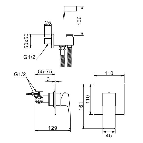 Качественный и современный смеситель с гигиеническим душем R01.53,06 одна рукоять для того, чтобы регулировать напор воды. Смеситель для биде устанавливается прямо внутрь стены, что позволит скрыть функциональные элементы, спрятать некоторые элементы монтажа. Латунная душевая лейка работает в одном режиме. Высокопрочный душевой шланг 1200 мм в оплетке двойного вальцевания с трубкой из синтетического каучука вращающийся на 360 градусов. Основной материал корпуса - латунь, проверенный временем материал, который обеспечивает идеальное напыление хромированного покрытия. Квадратная форма душ для биде делает его оригинальным и аутентичным.