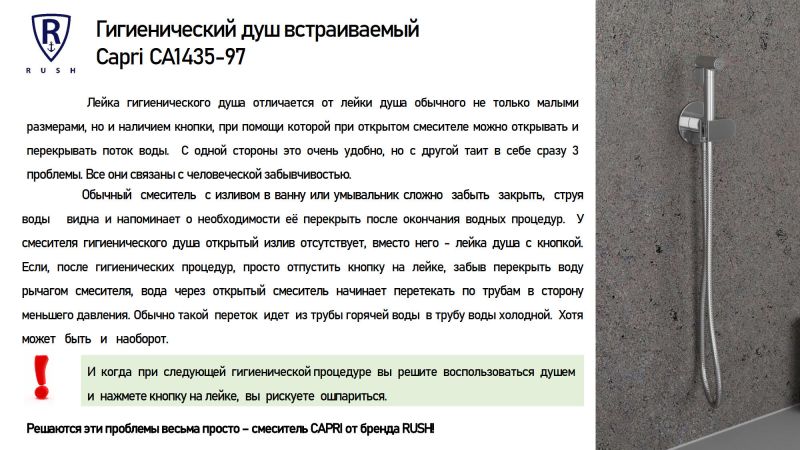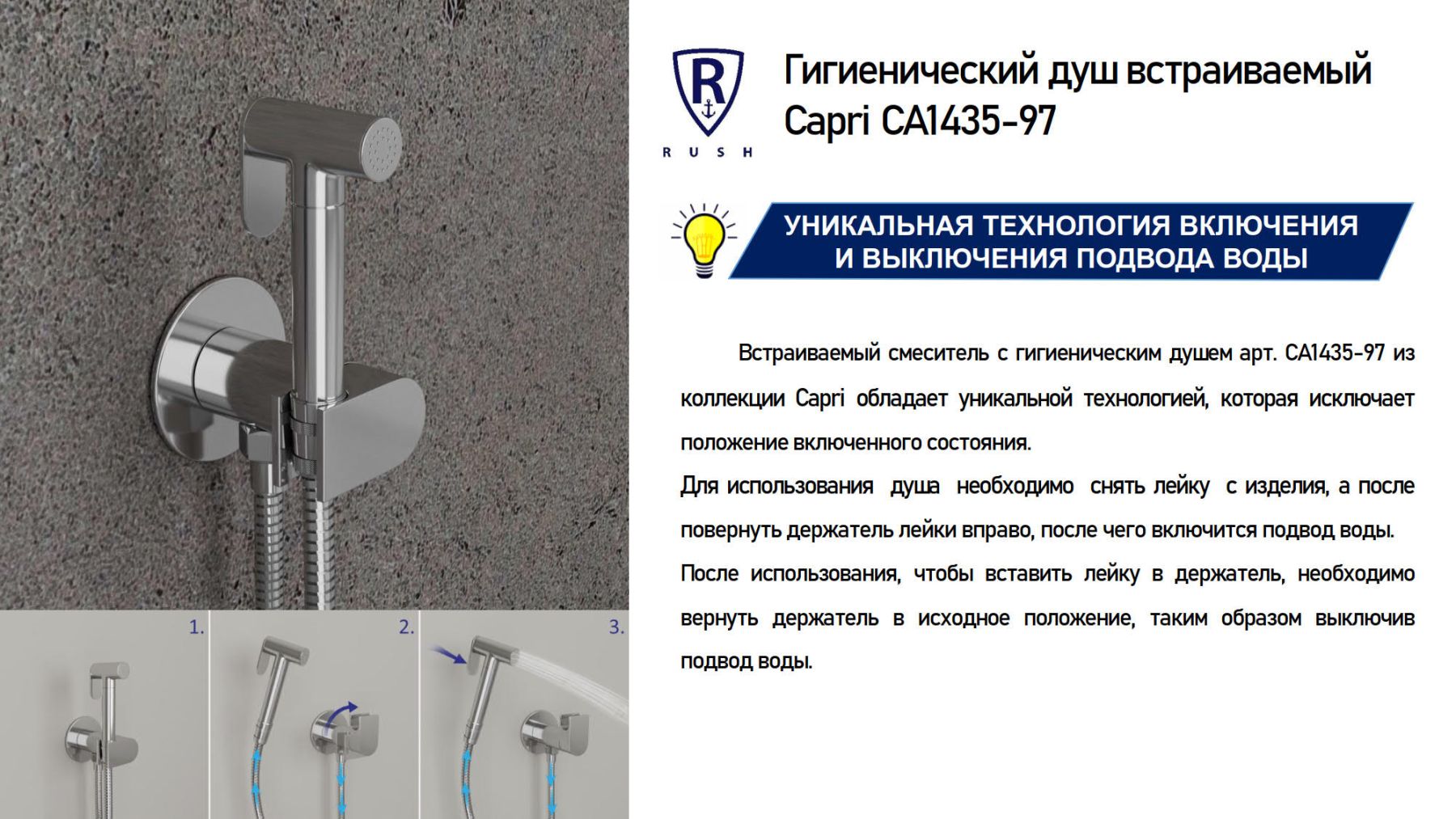 Встраиваемый смеситель с гигиеническим душем RUSH арт. CA1435-97 из коллекции Capri изготовлен из высококачественной латуни и имеет уникальное поворотное управление. В смеситель установлен картридж с керамическими пластинами Ф25. В комплекте душевая лейка, изготовленная из современной прочной пластмассы с никель-хромированным покрытием, металлический шланг двойной оплетки, подводка 1/2", индивидуальный пакет, паспорт, гарантийный талон. ЛЕЙКА НЕ ЯВЛЯЕТСЯ ВОДОЗАПОРНЫМ МЕХАНИЗМОМ! ПОСЛЕ ИСПОЛЬЗОВАНИЯ НАСТОЯТЕЛЬНО РЕКОМЕНДУЕМ ЗАКРЫВАТЬ РУЧКУ СМЕСИТЕЛЯ