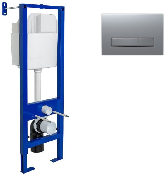 Узкая рама шириной 41 см.Металлический каркас, окрашенный антикоррозийной эмалью.Расчетная нагрузка 400кг. Объём резервуара воды 10 л с тепло- и шумоизоляцией.Подвод воды внутрь резервуара (G1/2 наружная).Объем смыва 3/6 литра с возможностью регулировки.Управление механическое, две кнопки.Межосевое расстояние под шпильки для подвеса унитаза 18 и 23 см. Полный комплект для установки включает в себяшумоизоляционную прокладку и лекало для монтажных отверстий.