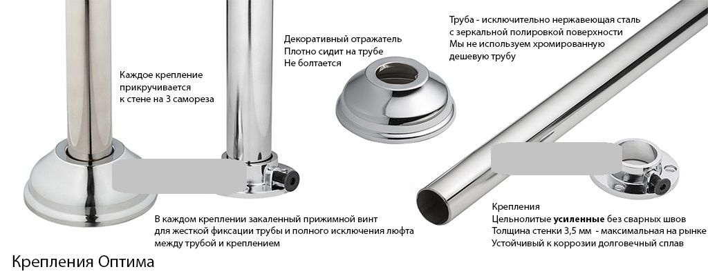 В каждом креплении каленый прижимной винт для большей жесткости фиксации трубы, люфт исключен