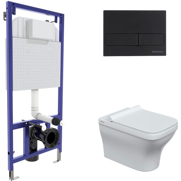 Комплект Berges 4в1 042449: инсталляция NOVUM кнопка L5 SoftTouch чёрная унитаз Strati Rimless сиденье Strati Slim SO