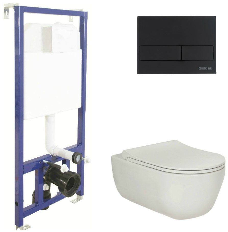 Полный комплект BERGES для монтажа подвесного унитаза. 1. Инсталляция NOVUM525Толщина бачка 80 мм.Межосевое расстояние под крепежные шпильки унитаза 18 и 23 см.Резервуар воды объемом 10 литров с тепло-шумоизоляцией.Уровень шума при давлении 3 бар не превышает 13 дБ.Подвод воды сверху (G1/2 наружная).Объем смыва 3/6 литра с возможностью регулировки. Металлический каркас, окрашенный антикоррозийной эмалью, расчетная нагрузка до 400 кг.Ножки регулировки высоты из оцинкованной стали. Возможность установки в угол. 2. кнопка L5 черная SoftTouchABS-пластик 3. унитаз EGO XL Rimless,безободковая система смыва, антибактериальное покрытиеэкономия воды, скрытый крепеж 4. сиденье дюропласт Toma Slim SOмикролифт, быстросъем. Все крепежи для установки в комплекте