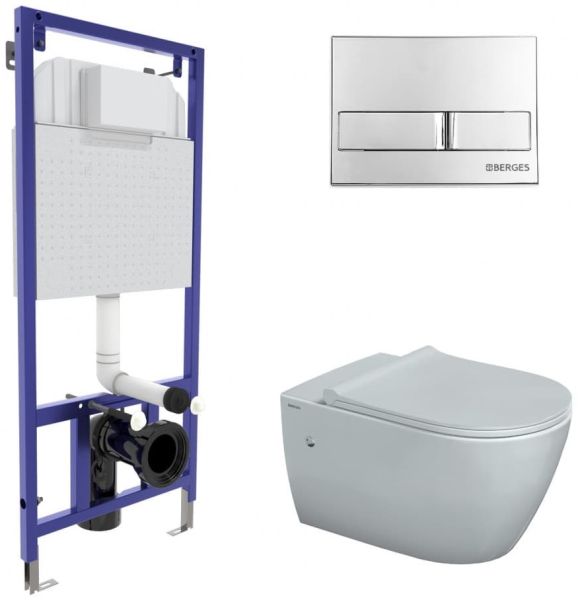 Полный комплект BERGES для монтажа подвесного унитаза. 1. Инсталляция NOVUM525Толщина бачка 80 мм.Межосевое расстояние под крепежные шпильки унитаза 18 и 23 см.Резервуар воды объемом 10 литров с тепло-шумоизоляцией.Уровень шума при давлении 3 бар не превышает 13 дБ.Подвод воды сверху (G1/2 наружная).Объем смыва 3/6 литра с возможностью регулировки. Металлический каркас, окрашенный антикоррозийной эмалью, расчетная нагрузка до 400 кг.Ножки регулировки высоты из оцинкованной стали. Возможность установки в угол. 2. кнопка L3 хром глянецABS-пластик 3. унитаз , MASCON Rimlessбезободковая система смыва, антибактериальное покрытиеэкономия воды, скрытый крепеж 4. сиденье дюропласт Toma Slim SOмикролифт, быстросъем Все крепежи для установки в комплекте