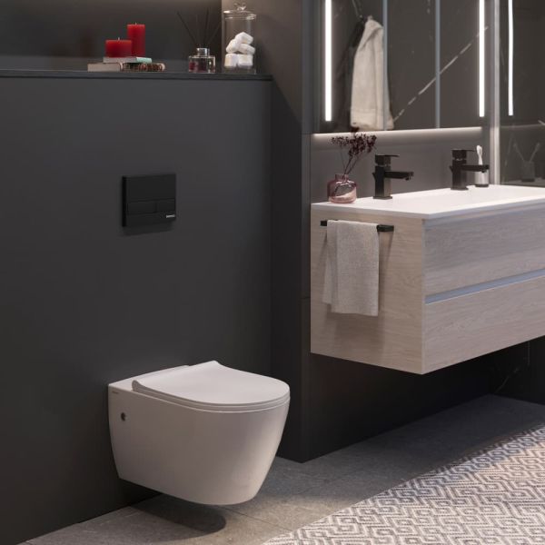 Комплект Berges 4в1 043217: инсталляция NOVUM525 кнопка L5 SoftTouch чёрная унитаз Mascon Rimless сиденье Toma Slim SO