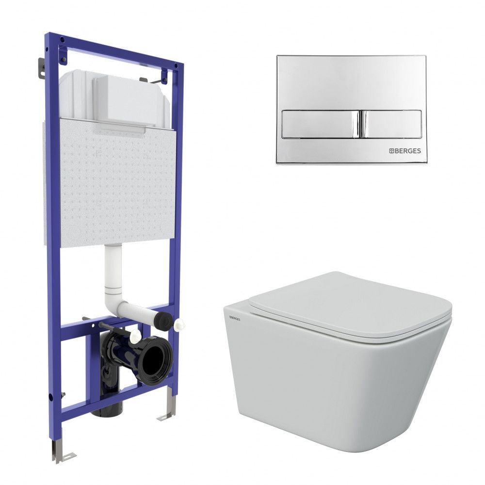 Полный комплект BERGES для монтажа подвесного унитаза. 1. Инсталляция NOVUM525Толщина бачка 80 мм.Межосевое расстояние под крепежные шпильки унитаза 18 и 23 см.Резервуар воды объемом 10 литров с тепло-шумоизоляцией.Уровень шума при давлении 3 бар не превышает 13 дБ.Подвод воды сверху (G1/2 наружная).Объем смыва 3/6 литра с возможностью регулировки. Металлический каркас, окрашенный антикоррозийной эмалью, расчетная нагрузка до 400 кг.Ножки регулировки высоты из оцинкованной стали. Возможность установки в угол. 2. кнопка L3 хром глянецABS-пластик 3. унитаз , FLOE S Rimlessбезободковая система смыва, антибактериальное покрытиеэкономия воды, скрытый крепеж 4. сиденье дюропласт Floe S Slim SOмикролифт, быстросъем Все крепежи для установки в комплекте