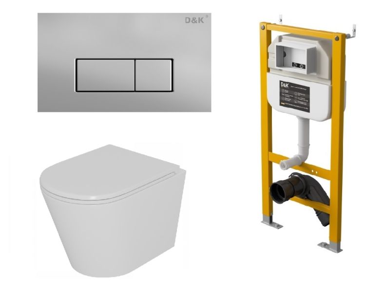 Комплект Унитаз подвесной безободковый DQ Venice DT1026016, 515*355*365мм, сиденье микролифт, белый+Инсталляция рамная скрытого монтажа DQ DI8050127, 500*117*1270мм, для подвесного унитаза+Клавиша смыва DQ Rhein DB1499002, матовый хром